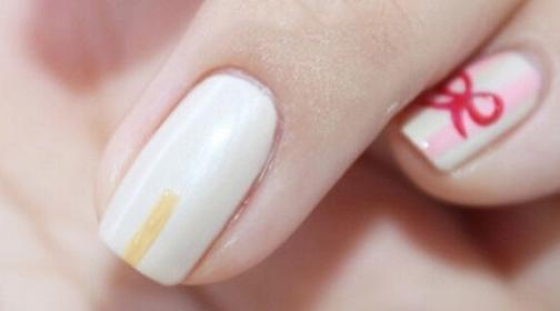 第一步:准备好所需的甲油和工具,刷上底油,照灯60秒。整甲刷上米色甲油,照灯60秒。用勾线笔沾取黄色甲油,在食指前缘画出色块,如图,照灯60秒。