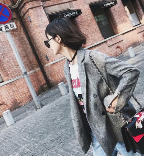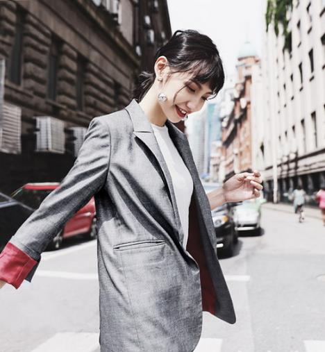 一粒扣灰色西装。充满复古感的格纹西装外套,袖口红与灰的撞色设计,赋予了西装全新的生命。挺括的版型,上身效果有气质但并没有太严肃。