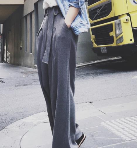 高腰灰色阔腿裤。腰间自由方式的抽带,可以根据身材的胖瘦自定松紧程度,实用又美观,个性十足。高腰长版型的设计,拉长腿部的线条,显高显瘦哦。
