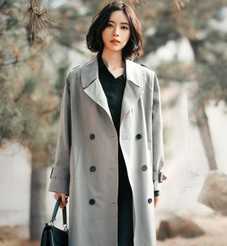 韩版灰色风衣。宽松慵懒的双排扣风衣,A能够遮住肉肉,从而达到显瘦的效果。袖口增添了绑带,可以随意调节大小更加方便舒适。