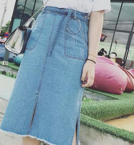 长款牛仔裙。基础款的牛仔裙未免显得太没有诚意。稍加改善便能令人眼前一亮。手工打制的毛边,侧边的微微开叉以及腰部同面料的细腰带,在细节之处用心处理,所以上身效果才能如此之好。