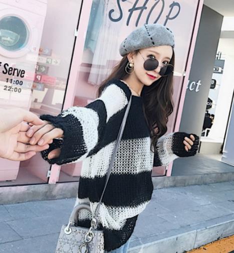 黑白条纹毛衣。宽松oversize款真的是每个女生都想入的一个款式,经典的黑白条纹是大爱,永远不会过时,宽松版型,遮住你的秋膘,显瘦迷人,穿着不束缚很舒适,稀疏的针织,小透视中有点小性感。