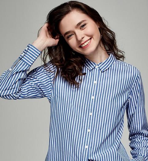 纯棉长袖蓝色条纹衬衫。经典的蓝白相间长袖衬衫,整体效果偏宽松,适合各种种类的身形。剪裁上有小方领设计,多一份内敛气息,经典的圆弧下摆设计又显得很休闲。可外搭宽松毛衣,以及将单侧的下摆掖进下装,穿出一种随意的效果。