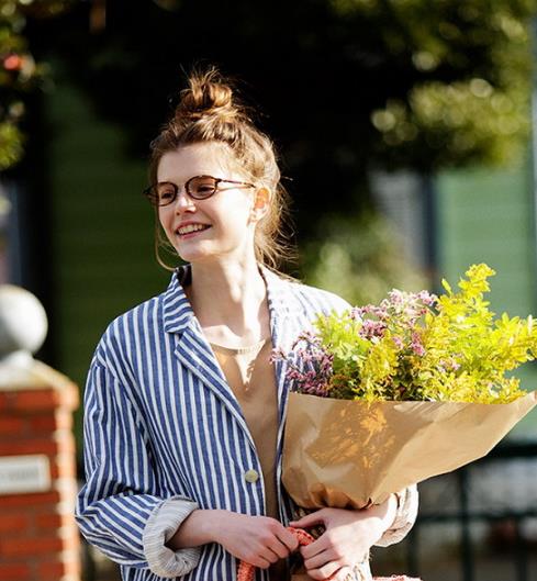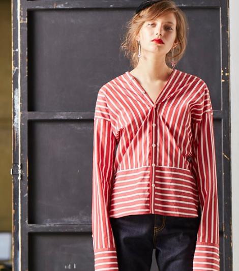 橘红色落肩袖衬衫,加长袖设计可以显得手臂更加修长,V字领效果露出锁骨轮廓,使得整个上装更加具有通透感。整体为短款设计,可以更好地调节身材比例,条纹又可最大限度地遮肉,是一款非常经典的衬衫。
