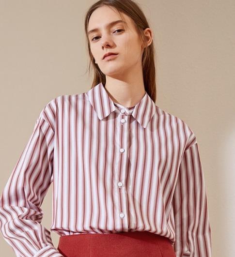 长袖方领铁锈红条纹衬衫。铁锈红的颜色略带一种成熟帅气的效果,条纹图案经过了渐变设计,显得更加立体。领口和袖口都有巧妙的设计,有活泼俏皮的气息。整体剪裁偏宽松,因此搭配纯色紧身短裙非常适合。