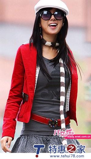 03 红色小西服内长外短的穿法,用一条亮色宽皮带实现颜色上的过渡,非常协调
