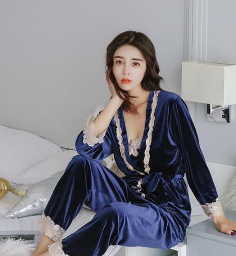 长袖金丝绒睡袍三件套。性感的丝绒材质的睡衣,由吊带上衣、长裤和长袖外套三件组成,刺绣花边女人味十足,有多种颜色可选,能满足不同审美需求。