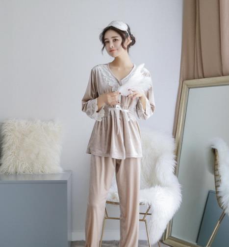 金丝绒吊带睡袍三件套。韩款的睡衣套装,天鹅绒面料贴身柔软,不起球不掉毛,由吊带衫、长裤和长袖睡袍构成的家居三件套组合,精致的花边,又美又舒适。