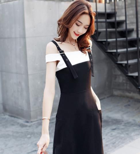 露肩一字领连衣裙。露肩一字领是夏季的必备款式哦,这款略有不同,蕾丝背带的设计帅气硬朗,裙身又修身妖娆,经典的黑白配更是好看哦。