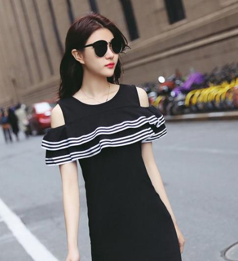 露肩荷叶边性感连衣裙。性感的露肩设计,清爽时尚,更能衬托纤细手臂。经典的黑白撞色条纹设计,唯美荷叶边波浪,更显迷人优雅。简约大圆领设计,时尚迷人,凸显迷人颈部与锁骨,简约大方。精选的舒适贴身棉面料,柔软亲肤,贴身透气又舒适。