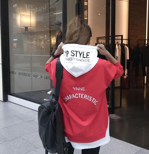 秋衣正浓,少不了一件防寒保暖的卫衣来给你增添温暖感,简单的款式,不失时尚个性味道,假两件套的方式,很有层次感,红白的撞色加入,搭配的刚刚好。