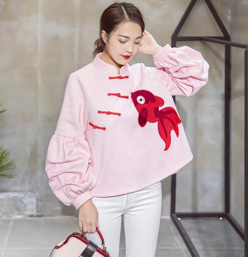 一点民族风,一点时尚感,几分俏皮。盘扣设计融入撞色显得格外突出,也就让人明白了民族风的意义。灯笼袖设计充满时代感,让复古不是本次的话题。俏皮的小金鱼贴花,点缀着青春无极限。