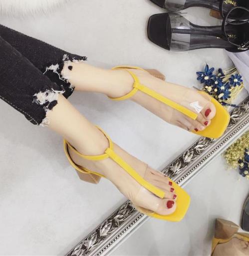 透明的鞋面显得个性又性感,一字带很好的增加了鞋子的细节设计,方头搭配粗跟,可以让你轻松穿出女王范。