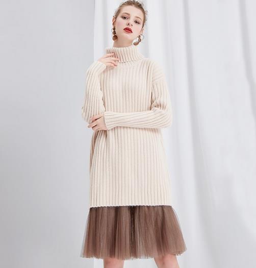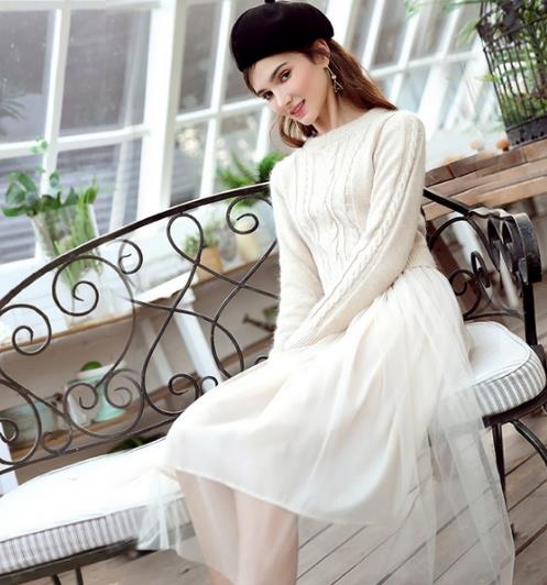 毛衣拼接网纱连衣裙