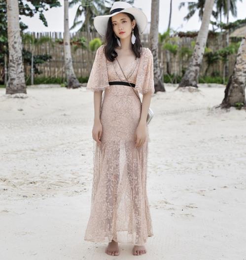 V领蕾丝长连衣裙